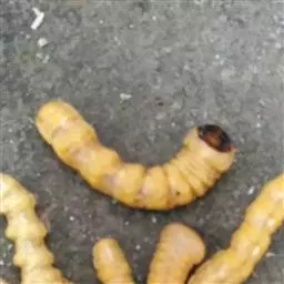 学名蛴螬,老熟幼虫体态肥胖,长约20mm,宽约6mm,体白色,头红褐色,静止时体形大多弯曲呈C型,体背多横纹,尾部有刺毛 。