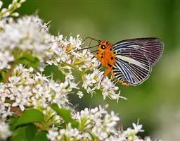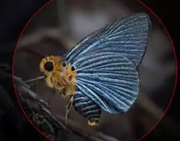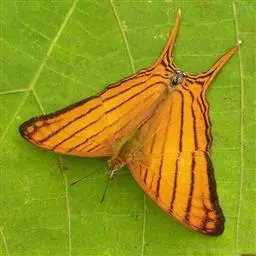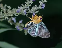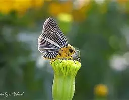 端及第七翅室中部。 雌蝶前翅长为11一 15毫米, 后翅长为 .8 , 毫米左右 ,翅面斑纹与雄蝶基本相同 , 只是前翅前缘下方的黄色条斑不太明显。 雌雄蝶后翅底面均为黄色,上有黑点数个 ,翅外缘均附有黄色缘毛。