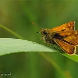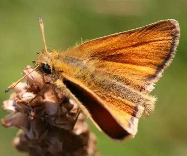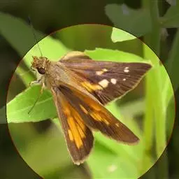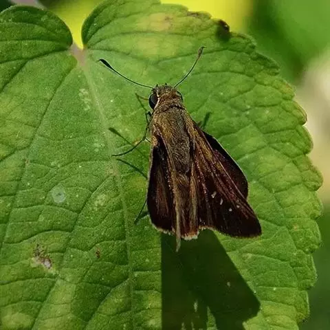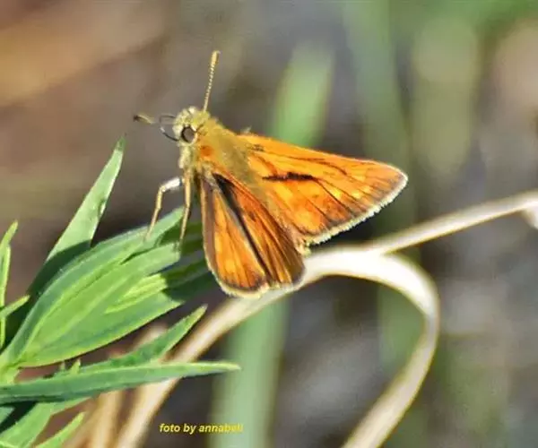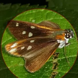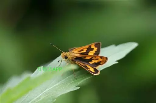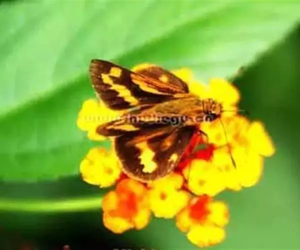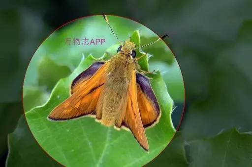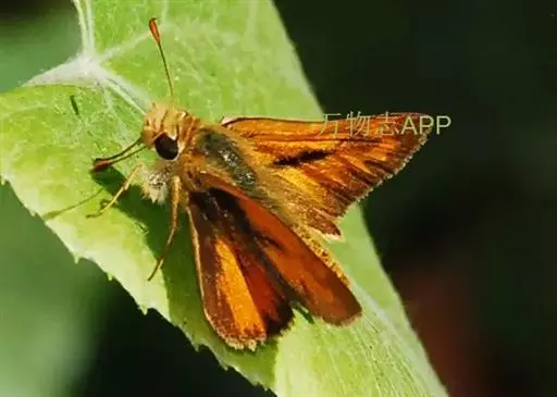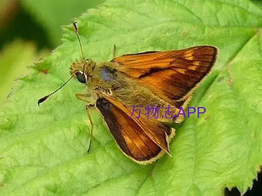 弄蝶科,展翅25 - 30 mm, 翅膀表面底色黑褐色,近后缘有一条橙黄色宽广的横带,翅腹面黄褐色具稀疏的黄斑,斑纹为近似种中较不明显。本种分布於平地至低海拔山区,常见於阳光下访花吸蜜,数量很多,为常见的种类。