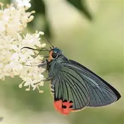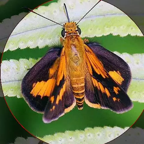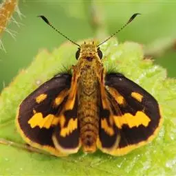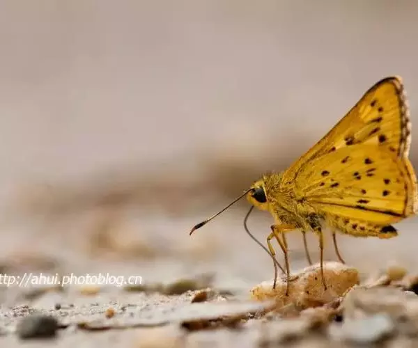 本种为小型种。 体长12一14毫米,头色黑褐, 复眼深黑色,具反光。 触角长约 7 毫米左右 。 丝状部分黄黑相间 , 棒状部的背面全黑,腹面全黄, 顶端有弯钩 , 几 为全黑色。 雄蝶前翅长为12毫米,翅面深黑,黄斑宽阔, 翅前缘下方和翅后缘上方各有一长条形黄色条斑一枚, 别卜在前翅中室内具有大型近似扁月形的黄斑一枚。 翅背面的黄斑略同翅面 , 后翅长 9.5毫米, 翅面黑色, 中域区饰有宽阔的一字黄斑一枚 , 其上方具有黄色圆点二枚, 分别位于中室外