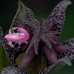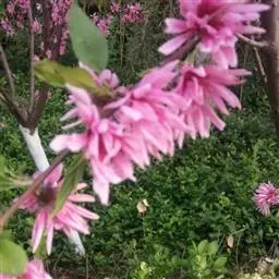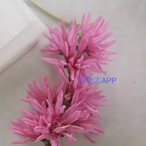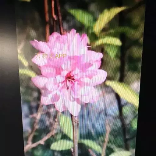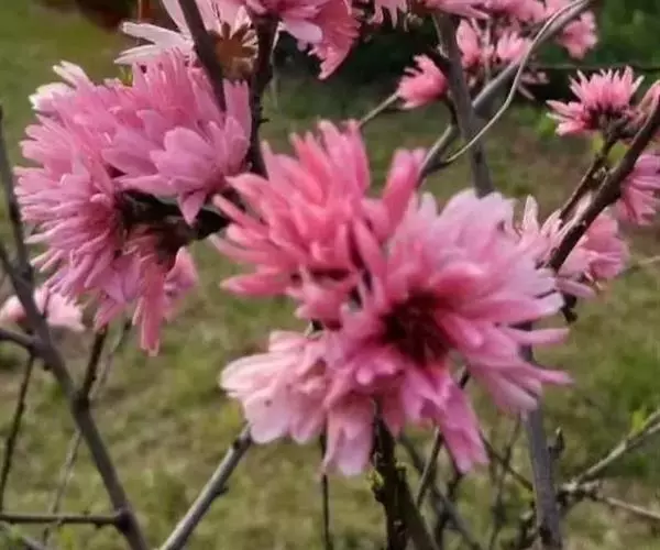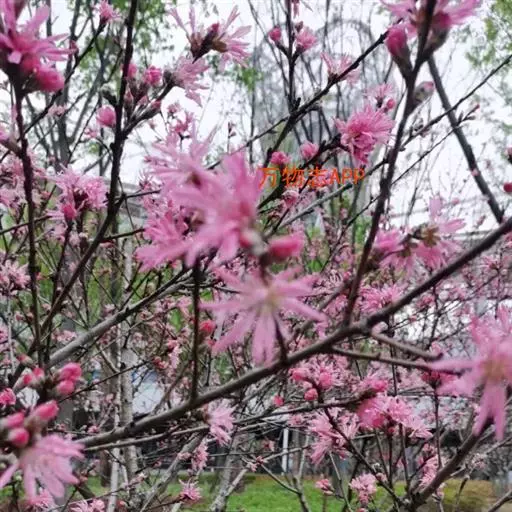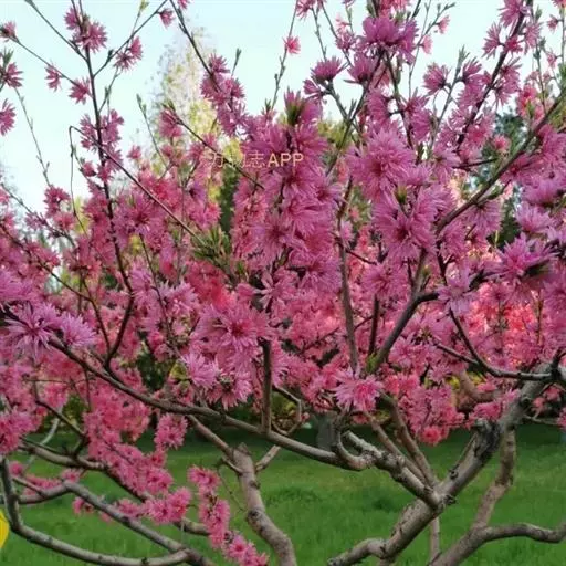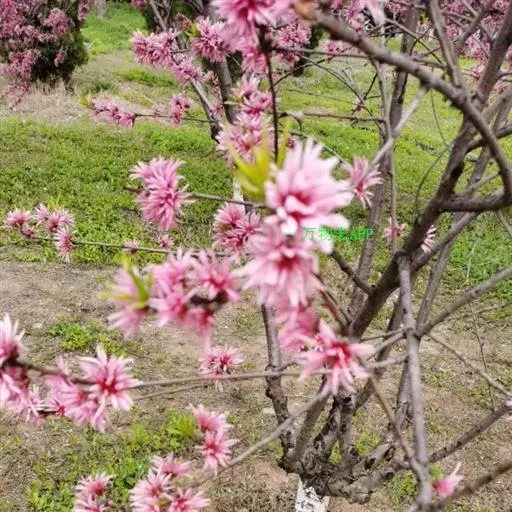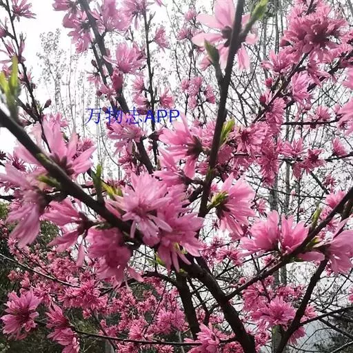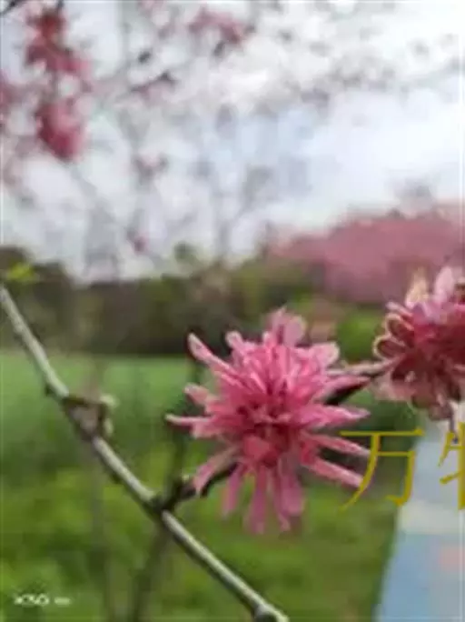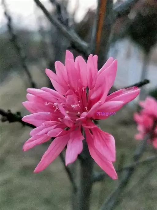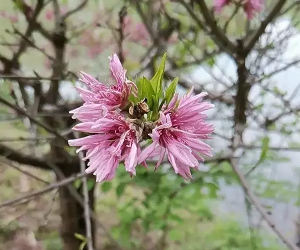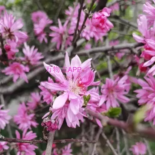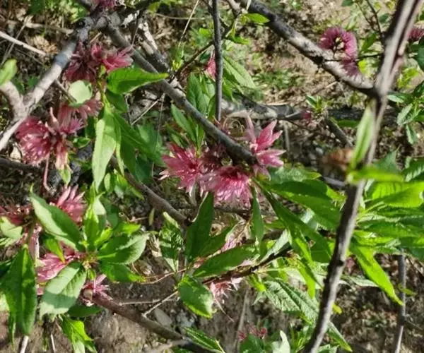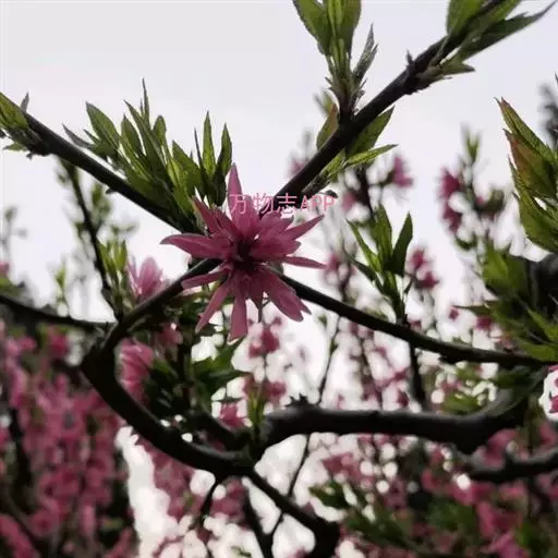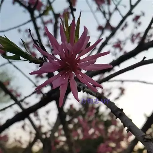 直枝桃类。树势中等;干皮深灰色,小枝细长柔弱,黄褐色,节间较长,2.3厘米。花粉色;花蕾卵形;花瓣披针卵形,不规则扭曲,边缘呈不规则的波状,长2.13厘米,宽0.6厘米;花径4.53厘米,复瓣,菊花型,花高2厘米;花瓣数29枚(22-32),雄蕊数平均32.7,花丝长1厘米,花丝卷曲,有瓣化现象,花药黄色;雌蕊略高于雄蕊;着花中等;花萼红褐色偏绿,两轮;花梗长0.43厘米。叶绿色略显灰,边缘略卷,椭圆披针形,长10.2厘米,宽2.82厘米,叶长与叶宽比(L/W)为3.62;叶缘细锯齿,叶柄0.92厘米;肾形蜜腺2-3个。果实绿色,尖圆形,长4.02厘米,宽3.05厘米;果核长2.92厘米,宽1.56厘米,椭圆形;核面粗糙。花期4月中旬。