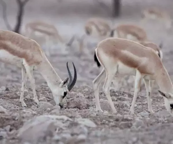 鹅喉羚属于典型的荒漠和半荒漠地区的种类,栖息在海拔300-6000米之间的干燥荒凉的沙漠和半沙漠地区。 茫茫荒漠几乎是贫瘠、荒凉和死亡的代名词,但鹅喉羚仍然能依靠生长在荒漠上的红柳、梭梭草、骆驼刺和极少量的水存活下来并繁衍着后代。