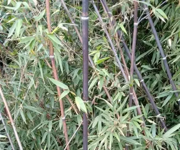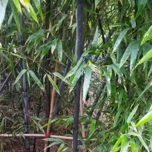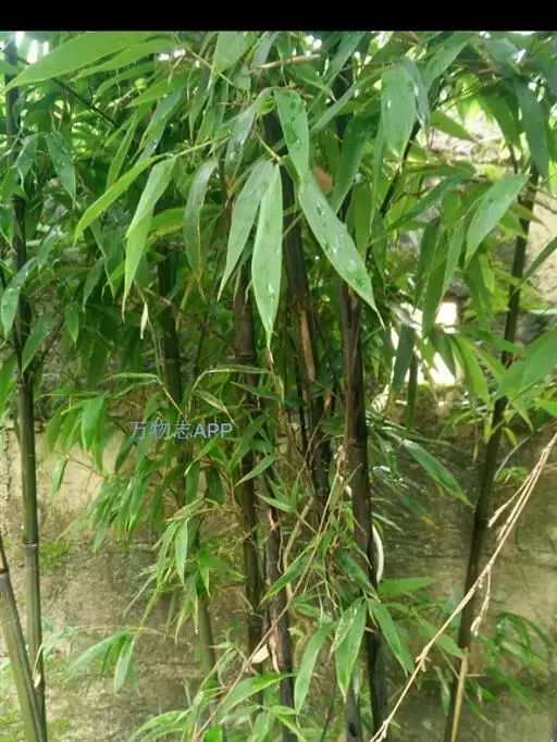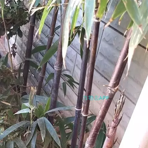 紫竹(学名:Phyllostachys nigra (Lodd. ex Lindl.)Munro):竿高4-8米,稀可高达10米,直径可达5厘米,幼竿绿色,密被细柔毛及白粉,箨环有毛,一年生以后的竿逐渐先出现紫斑,最后全部变为紫黑色,无毛;箨片三角形至三角状披针形,绿色,但脉为紫色,舟状,直立或以后稍开展,微皱曲或波状。末级小枝具.2或3叶;叶片质薄,长7-10厘米,宽约1.2厘米。花枝呈短穗状,佛焰苞4-6片,除边缘外无毛或被微毛,叶耳不存在,鞘口繸毛少数条或无,缩小叶细小,通常呈锥状或仅为一小尖头,亦可较大而呈卵状披针形。小穗披针形,长1.5-2厘米,具2或3朵小花;花药长约8毫米;柱头3,羽毛状。笋期4月下旬。