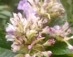 小灌木。茎常弯曲,高达30厘米,幼枝具褐色毡毛,节间短。叶对生,具叶柄;叶片长圆形,长圆状倒披针形或披针形,长5.5-25厘米,宽2.4-9厘米,顶端短尖,基部楔形或宽楔形,边缘生小钝齿或近全缘,幼时上面被灰白色或淡褐色绵毛,后变近无毛,下面密被淡褐色毡毛,侧脉每边10-13条,下面隆起;叶柄长3-6厘米,被褐色毡毛。聚伞花序伞状,成对腋生,具10余花;花序梗长2.5-5.5厘米,密被褐色毡毛;苞片2,圆卵形,长1-1.5厘米,宽9-12毫米,顶端钝,基部合生,全缘;花梗长8-10毫米,具短绵毛。花萼绿白色,常带紫色,5裂至近基部,裂片相等,倒披针状匙形,长8-13毫米,宽4-6毫米,顶端圆形,全缘,两面近无毛。花冠紫蓝色,长1.5-2厘米,直径约1.5厘米,外面无毛;筒长1-1.3厘米;檐部广展,稍二唇形,上唇比下唇略短,2裂,裂片相等,近圆形,长约7毫米,宽约5毫米,下唇3裂,裂片相等,近圆形,长约5毫