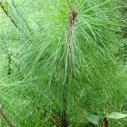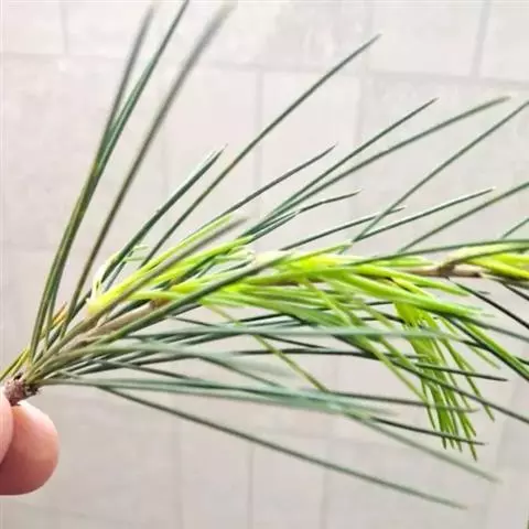 针叶5针一束,长6-12厘米,粗硬,直,深绿色,边缘具细锯齿,背面通常无气孔线,腹面每侧具6-8条淡蓝灰色的气孔线;横切面近三角形,皮下层细胞单层,但在背面两树脂道之间常出现断续的分布着1-3或多至15个细胞宽的第二层皮下层,树脂道3个,中生,位于三个角部;叶鞘早落。