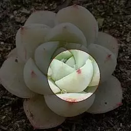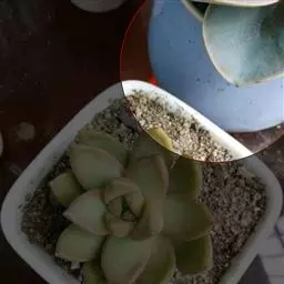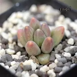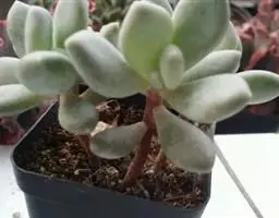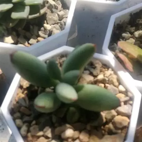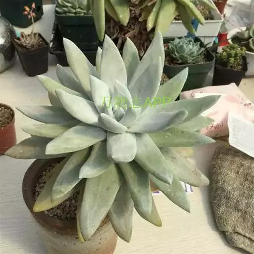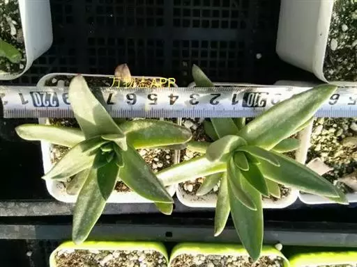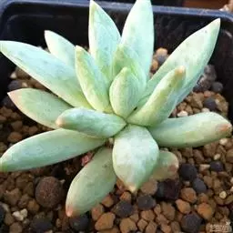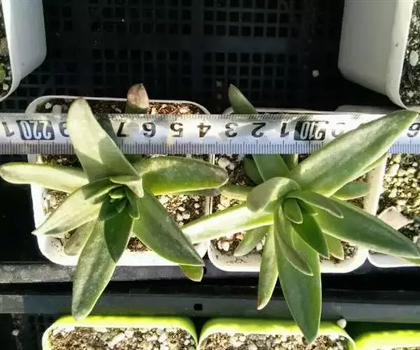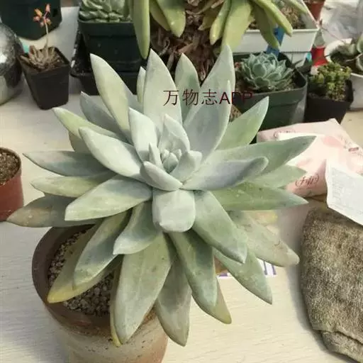 仙女杯白菊为小型仙女杯品种,易群生,茎短且粗壮,老桩适合做多肉盆景。叶片形态为长锥型,较厚质,叶色为灰绿色,表面带有粉,尤以叶片前端的粉末较多。
