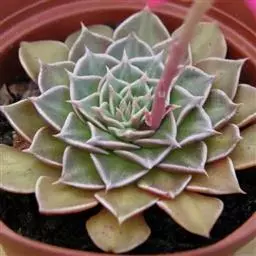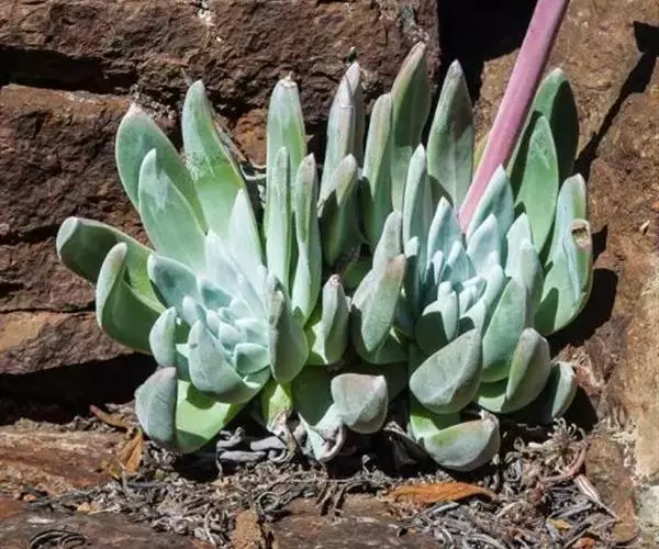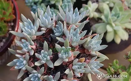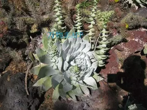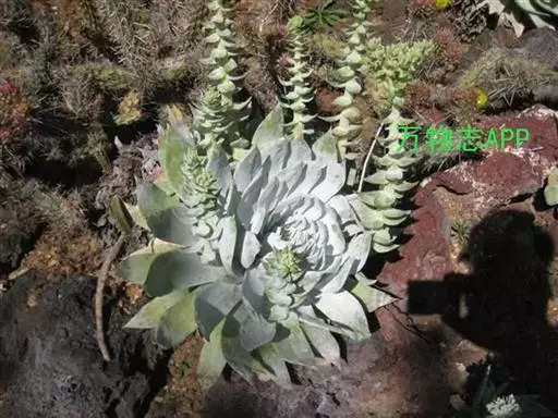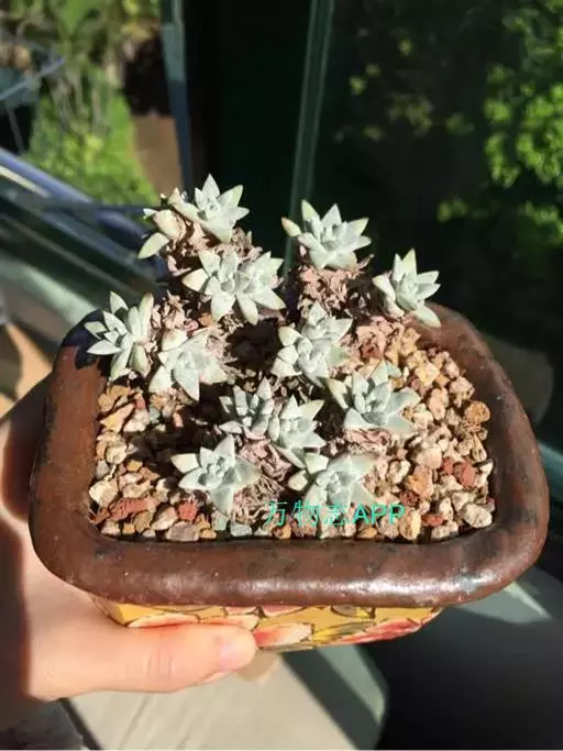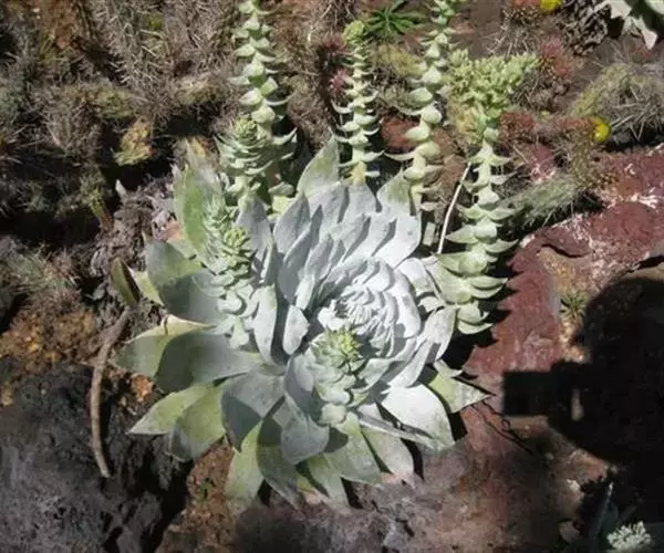 又名初霜,主要分布于美国俄勒冈州和加利福尼亚州北部。主要特征为株型呈莲座,身披白霜,叶片无毛,生长于莲座的基部,叶片呈银灰色,微微透出绿,在阳光充足的生长环境下,叶缘表现为明亮的红色。淡绿色花序,花小而多,颜色为亮黄色。