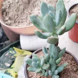 蓝黛莲是一种景天科厚叶草属植物。叶片呈略扁的圆柱形,排列成莲座状;颜色为灰绿色,…