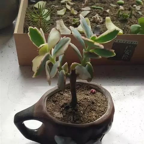 三色花月锦是景天科青锁龙属多肉植物,燕子掌的栽培品种,叶片有红、黄、白斑块,色彩斑斓。花期秋季。