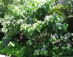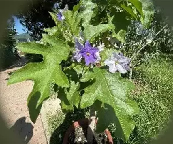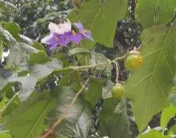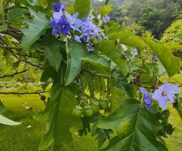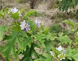 大花茄,别名木番茄,原产南美洲的玻利维亚至巴西。常绿大灌木或小乔木,株高3至5米,茎直立,小枝及叶柄具刚毛与皮刺,叶互生,叶片大、通常羽状半裂,叶面具刚毛状单毛。花腋生,花冠粉红色,果实大。