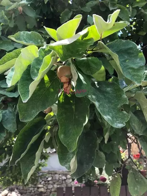 树冠比大榅桲小,开张,叶长约8.3cm,宽约7.2cm,叶柄长约1.4cm,叶大。果实球形或扁圆形,纵径6.4cm,横径7.3cm。果面沟纹不规则,凸凹不平。果皮绿色,毡茸厚,灰白色,不易脱落。果梗部有绿色瘤,扁平。萼片残存,萼洼广浅。果肉白黄色,味甜酸,涩味浓,汁多,肉粗松,经贮藏后仍呈绿色或黄绿色,种子黑褐色。果实成热后能长期在树上不落,极耐贮藏。