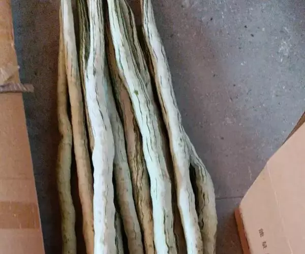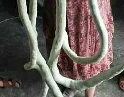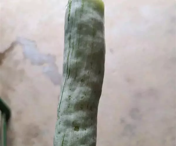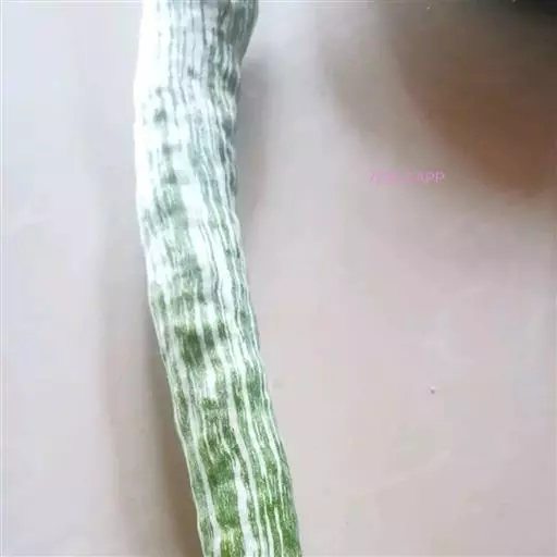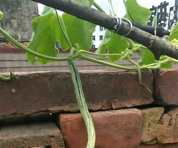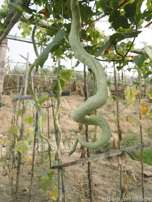 蛇瓜自瓜柄开始有数条绿色线纹,瓜体有的垂直,有的弓身,有的弯曲,有的卷尾,酷似—条条长蛇在棚架下展姿。在嫩瓜期,瓜体表面有白绿色相间的条纹似白花蛇,老熟后的瓜体表面又呈现红绿色相间的条纹似红花蛇,体态各异,栩栩如生,稀奇而美观。