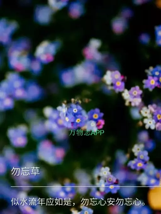 勿忘草原是一种极普通的花草。人们之所以送给它“勿忘我”这样的极富诗意的名字,是源于这么一个美丽的传说:欧洲古代有一位骑士,他带着恋人到海滨游览。恋人看到水边有一丛小花,要采来插戴。骑士为表示自己对恋人的爱情,涉水去采。不料海潮汹涌而来,把他去了。骑士忙将那丛花用力抛到岸上,大声喊道:“不要忘了我!”后来,人们就把这种花叫做“勿忘我”花。这种花由于寄寓了一种深沉的爱,人们就把它看做花中的情种,男女相爱,往往把它扎成花束互相赠送,代表“勿忘我”相思之情,表示双方的深恋密爱。 [8-9]