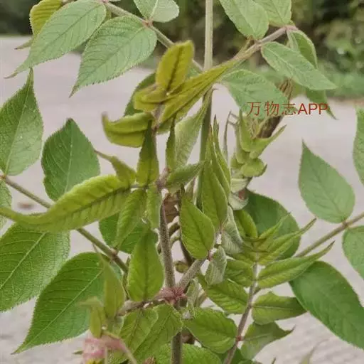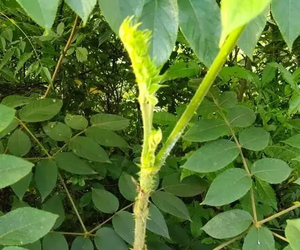 灌木或乔木,高2-5米,稀达8米,胸径达10-15厘米;树皮灰色,疏生粗壮直刺;小枝通常淡灰棕色,有黄棕色绒毛,疏生细刺。叶为二回或三回羽状复叶,长60-110厘米;叶柄粗壮,长可达50厘米;托叶与叶柄基部合生,纸质,耳廓形,长1.5厘米或更长,叶轴无刺或有细刺;羽片有小叶5-11,稀13,基部有小叶1对;小叶片纸质至薄革质,卵形、阔卵形或长卵形,长5-12厘米,稀长达19厘米,宽3-8厘米,先端渐尖或短渐尖,基部圆形,上面粗糙,疏生糙毛,下面有淡黄色或灰色短柔毛,脉上更密,边缘有锯齿,稀为细锯齿或不整齐粗重锯齿,侧脉7-10对,两面均明显,网脉在上面不甚明显,下面明显;小叶无柄或有长3毫米的柄,顶生小叶柄长2-3厘米。