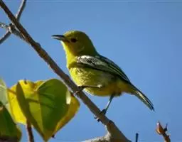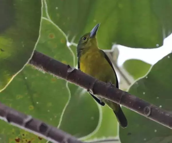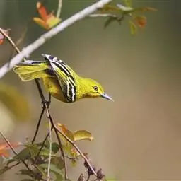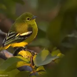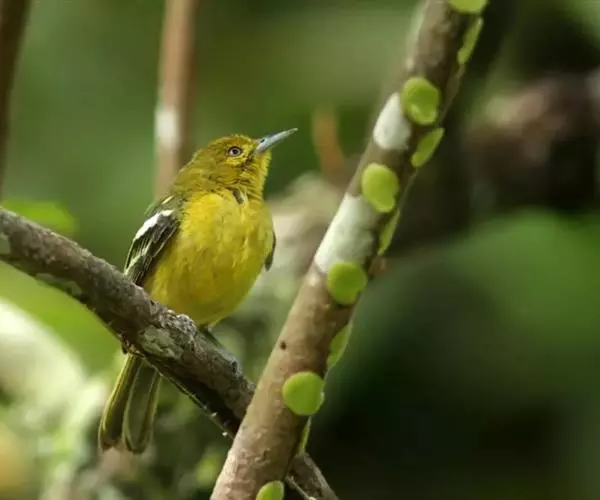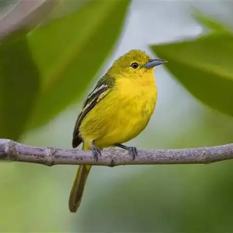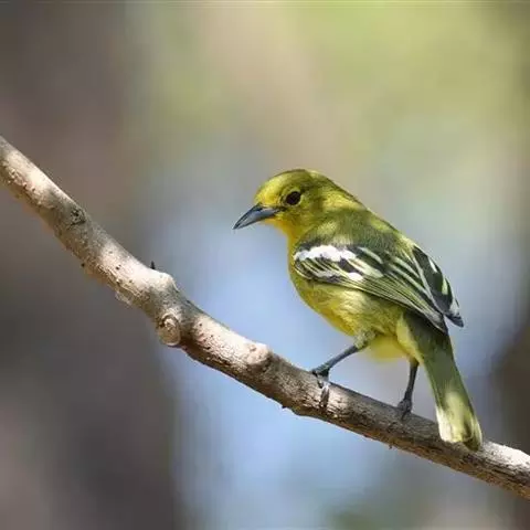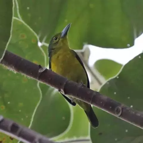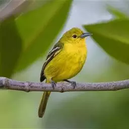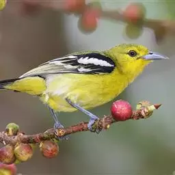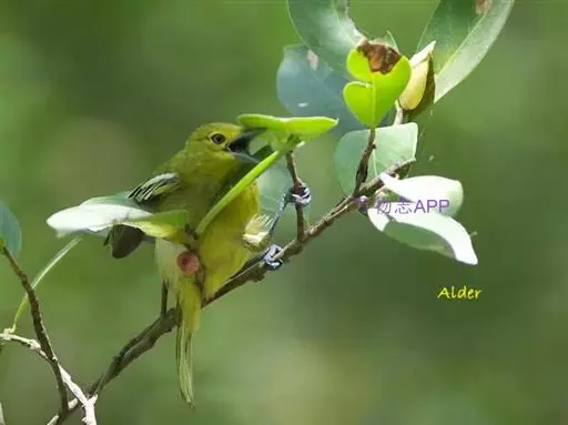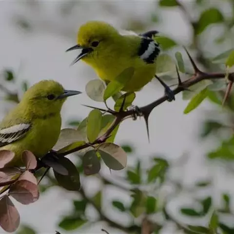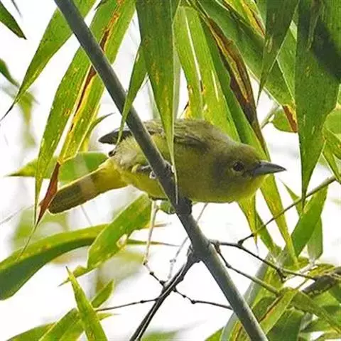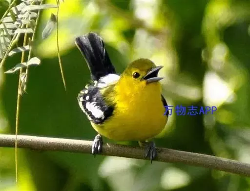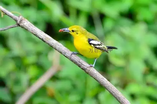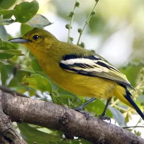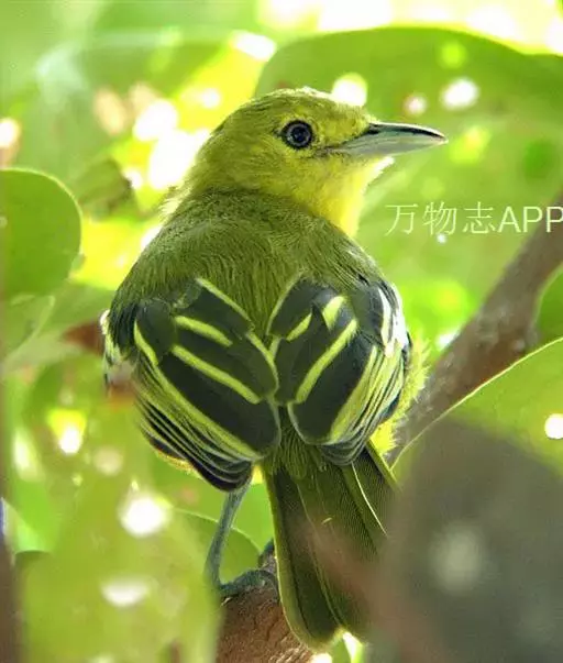 黑翅雀鹎(学名:Aegithina tiphia):体重14-19克,体长11.5-16厘米。是树栖性绿色小鸟,外形与叶鹎相似,下体黄色。鸟喙直,翼长而尖,总体羽毛是绿色和黄色相结合,翼上具两道明显近白色横纹,翼近黑而羽缘白。虹膜灰色、淡黄色或棕红色,嘴灰蓝色、银灰色或黑色,跗蹠灰色。