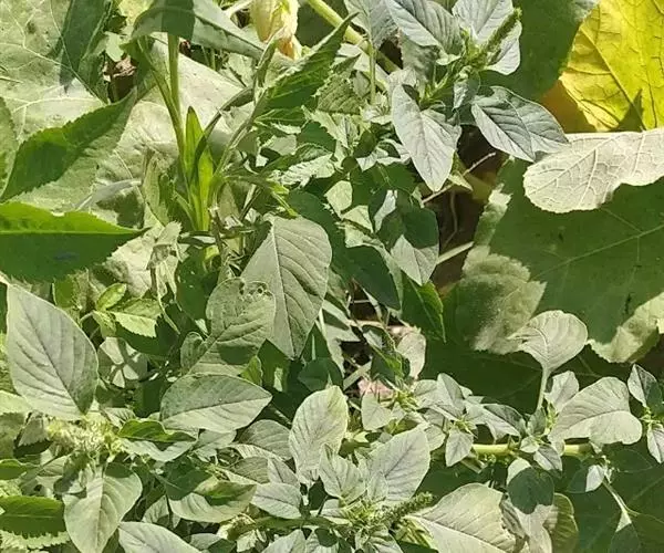 反枝苋是苋科苋属的一年生草本植物。株高达1米;茎密被柔毛;叶菱状卵形或椭圆状卵形,先端锐尖或尖凹,…