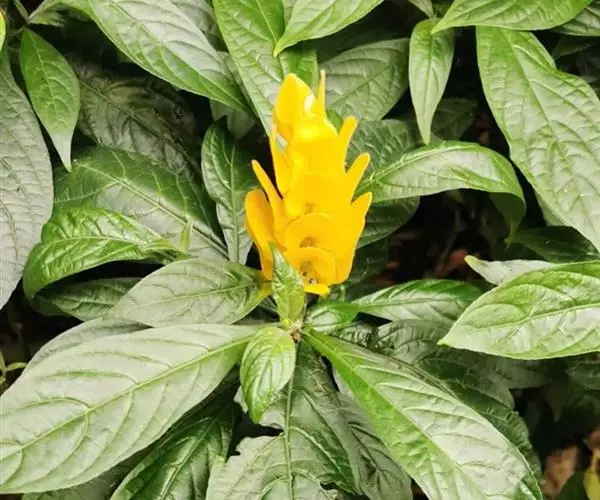 常绿灌木,高达1米,多分枝。叶对生,狭卵形,长达12厘米,亮绿色,叶面皱褶有光泽。穗状花序顶生,长达10-15厘米,直立:苞片心形、金黄色,排列紧密,花白色,唇形,长约5厘米,从花序基部陆续向上绽开,金黄色苞片可保持2-3个月。 金苞花