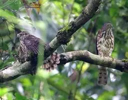 雌鸟上体暗褐色,头缀以棕白色羽缘,背和肩具窄的棕色羽缘;尾羽灰褐色,具黑褐色横斑;翅外侧飞羽暗褐色,具黑褐色斑纹和内翈基部白色,内侧飞羽灰褐色,具暗褐色横斑纹;初级覆羽灰褐色,其余覆羽褐色,具棕色端缘。下体污白色,具黑褐色纵纹。