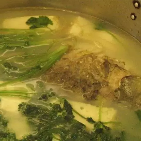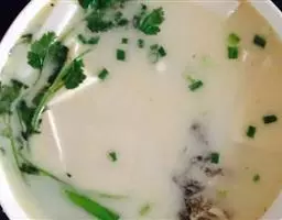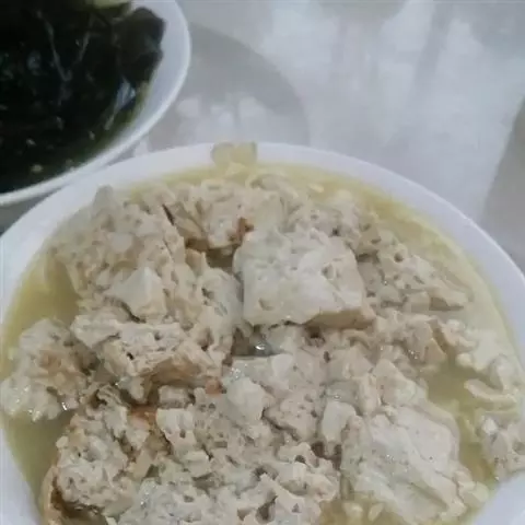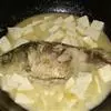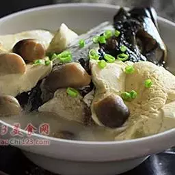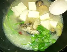 3、将做法(二)放入石锅,放改刀成块状的豆腐,加入鸡精、盐、白糖调味,大火烧开后改小火再炖十分钟。