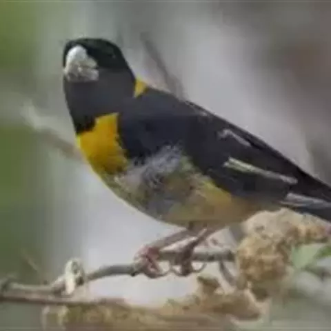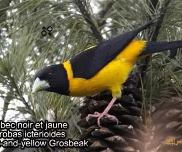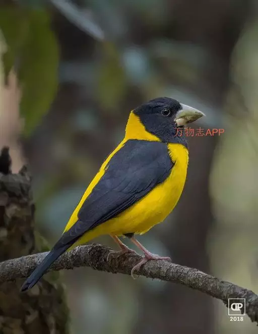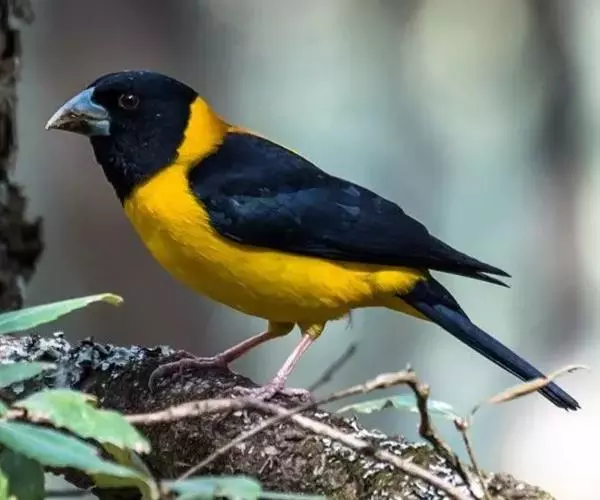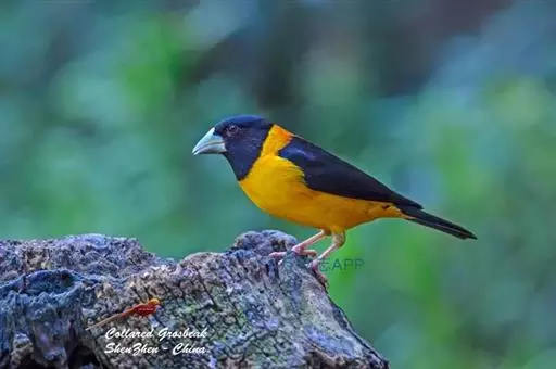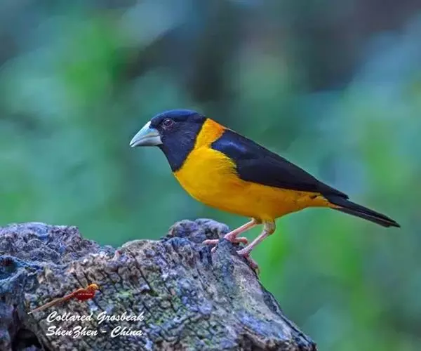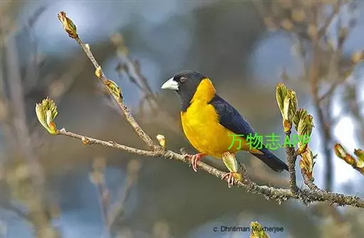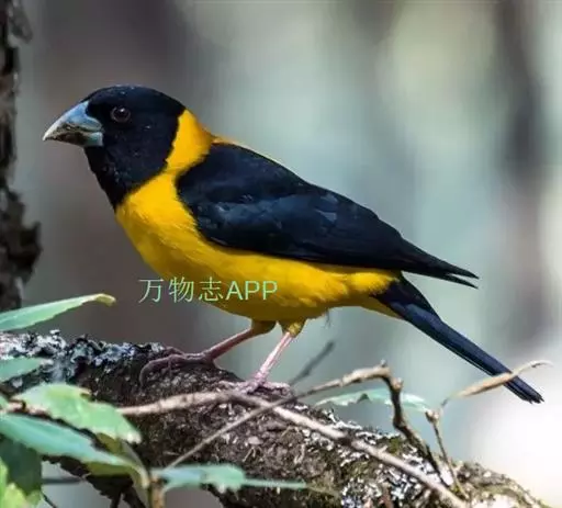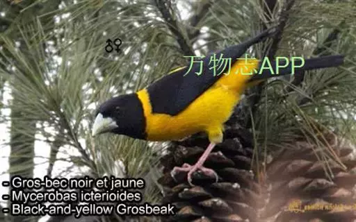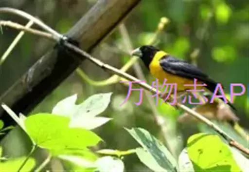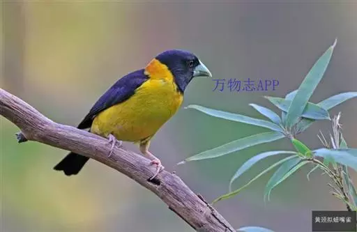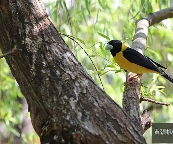 黄颈拟蜡嘴雀(学名:Mycerobas affinis):小型鸟类,体长20-22厘米。嘴粗大,黑色。雄鸟整个头、颈、颏、喉和上胸辉黑色,两翅和尾亦为黑色,其余上体橙黄色,下体鲜黄色。雌鸟头、颈、颏、喉和上胸中央灰色或暗灰色,背、肩和两侧覆羽橄榄绿色,腰黄色,两翅和尾黑色,下体橄榄黄色。