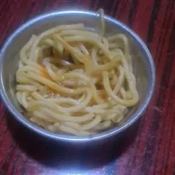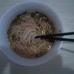 4.把烫过绿豆芽的水烧开后放入面条煮熟,然后捞出面条浸入冷开水后捞起盛入碗内。