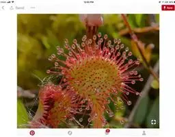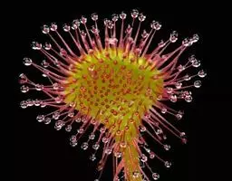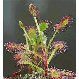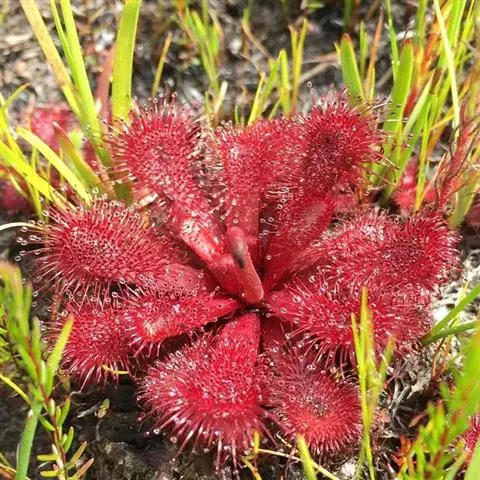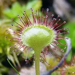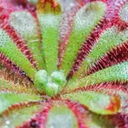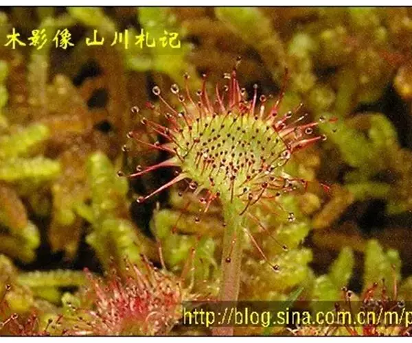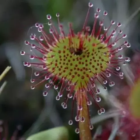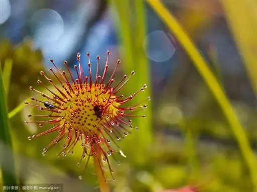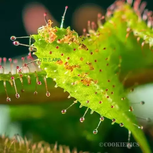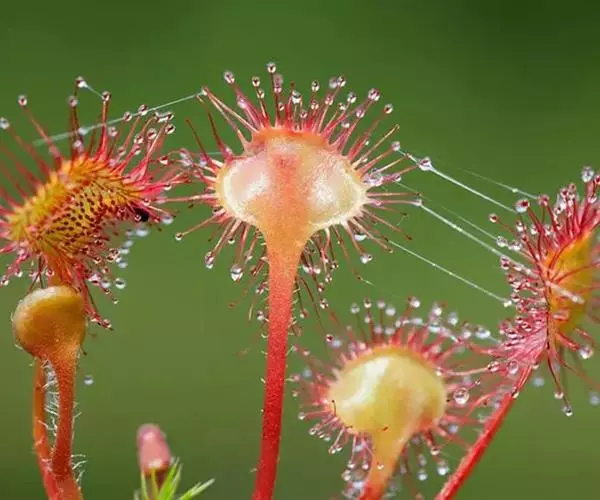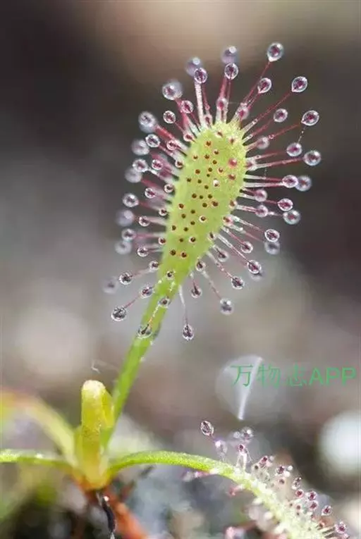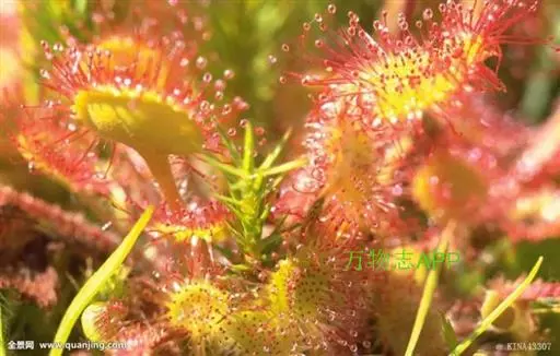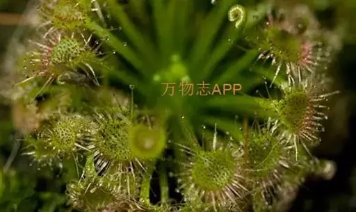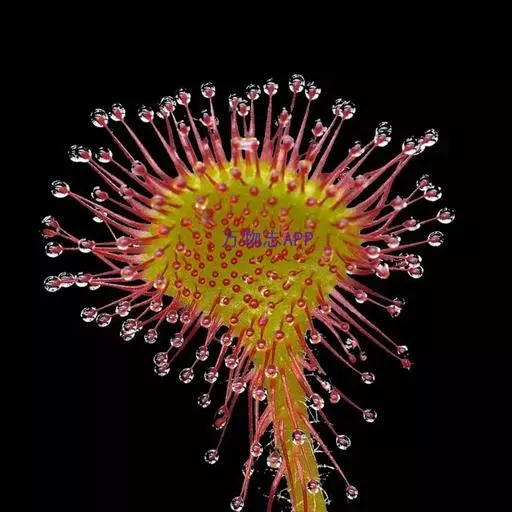 茅膏菜的叶上长着象露珠一样晶莹剔透的腺毛,这就是她们的捕虫器。就在腺毛的顶端有一个球状体,时常呈现出鲜艳的色彩,大多为红色,上面布满腺体,能分泌吸引昆虫的蜜汁与粘液的混合物和消化酶,外表就象是嵌有红宝石的水晶,如此的精美都无法想象这就是昆虫的死亡陷阱。当挡不住诱惑的昆虫来采食时,却发现自己已被粘住,恐慌中竭力的挣扎,结果周围的腺毛一起弯过来,有时叶片也会随之卷起,粘的更牢了。无法逃脱的昆虫被这些腺毛消化吸收,等消化吸收完全后,叶片和腺毛又重新展开,等待新的猎物。
