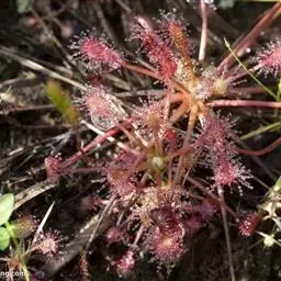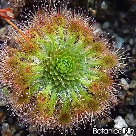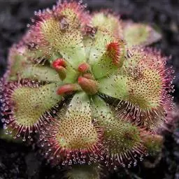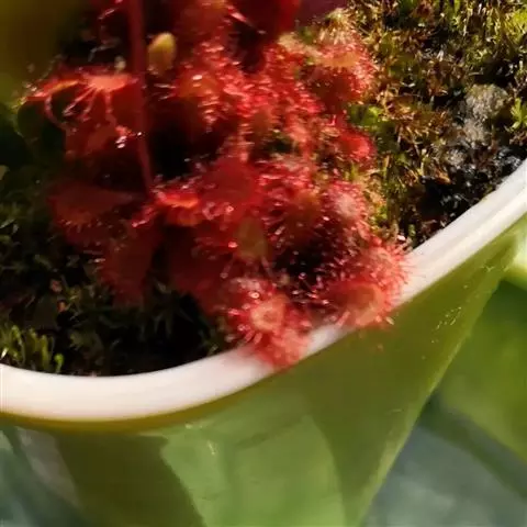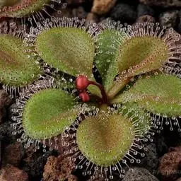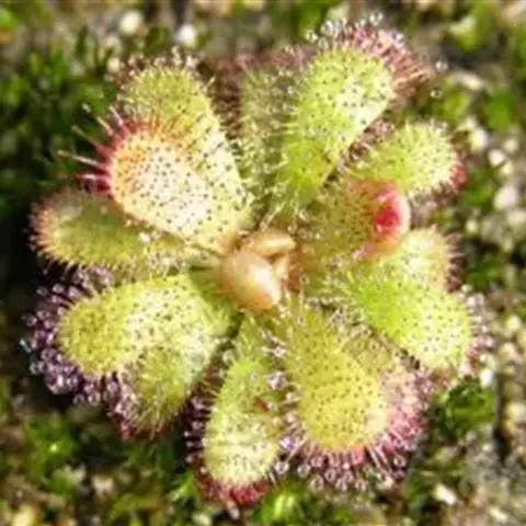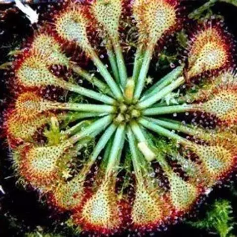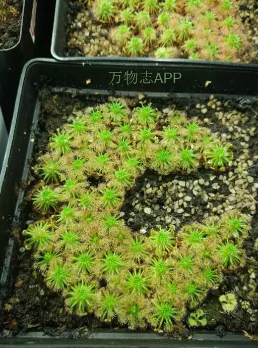 迷你茅膏菜学名圆叶茅膏菜(Drosera rotundifolia L.),又名毛毛苔、迷你毛毡苔和迷你茅膏菜,茅膏菜科植物。多年生草本,茎短,叶基生,叶片圆形或扁圆形,螺状聚伞花序1-2条,腋生,花葶状,纤细,直立,蒴果,熟后开裂为3果爿,种子多数,椭圆球形,花期夏、秋季,果期秋、冬季。茅膏菜不能适应寒冷或暴晒等自然环境,对恶劣的环境没有很强的抵御能力,寒冷与炎热地带不适宜生存。圆叶茅膏菜产于我国吉林和黑龙江,欧洲中部和北部、亚洲和美洲北部等寒冷地带也有分布,常生于海拔900-1000米的山地湿草丛中。圆叶茅膏菜全草可作支气管炎祛痰药。