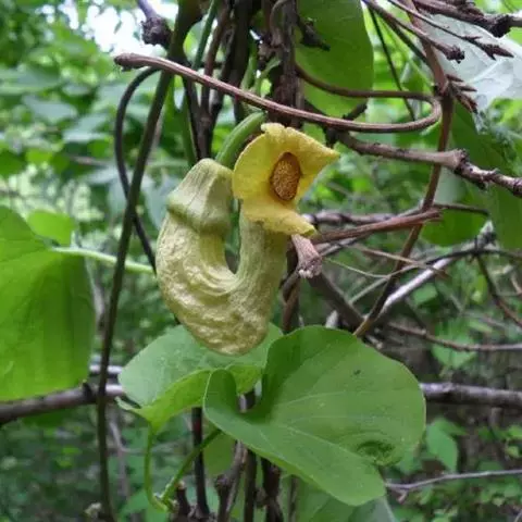 多年生常绿蔓性藤本植物,全株无毛,叶互生,三角状心形或肾形,长3-8厘米,宽8-10厘米,顶端钝圆,基部心形。春末至秋季开花,花单生于叶腋,花柄细长,无花萼花瓣之分,有喇叭状的花管,花被合生,向上弯曲,在管口处有一侧斜升的舌状片,管的基部膨大。整个花冠上有深紫色斑点和斑纹,形状象一个烟斗,故名烟斗花。花淡绿色,外部密布褐色网纹,内部密被白色柔毛。蒴果长筒状,形似小杨桃;成熟后由花柄处裂开,呈吊篮状悬挂在空中。 [1-2]
