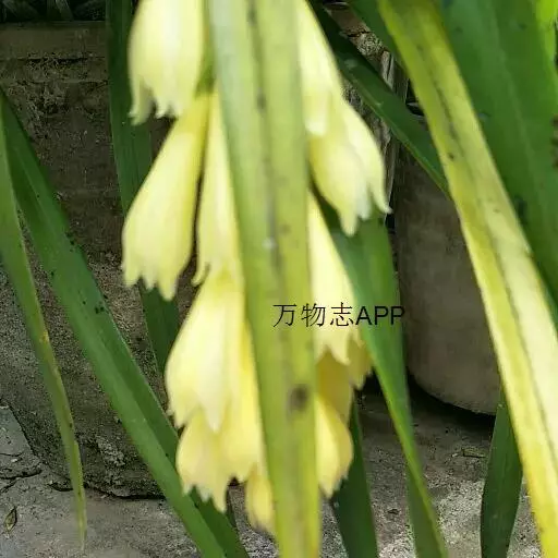 附生草本;假鳞茎近卵形,长4-9厘米,宽2-3厘米,包藏于叶基之内。叶6-13枚,二列,带形,长45-80厘米,宽1-1.7厘米,先渐尖或钝,通常略2裂,关节位于距基部4-10厘米处。花葶从假鳞茎下部叶腋内长出,通常长40-50厘米,下弯;总状花序下垂,具20余朵花;花苞片小,长2-3毫米;花梗和子房长1.2-2.1厘米;花下垂,狭钟形,几不开放,稍有香气,奶油黄色至淡黄绿色,有时略有淡粉红色晕或唇瓣上偶见少数红斑点,褶片亮橙黄色;萼片狭倒卵状披针形,长3.4-4.3厘米,宽7-9毫米;花瓣宽线状倒披针形,长3-4厘米,宽5-6毫米;唇瓣倒披针状三角形,长3-4厘米,3裂,基部与蕊柱合生约2-3毫米;侧裂片多少围抱蕊柱,常具很小的乳突,边缘无缘毛;中裂片较小,长8-10毫米,宽5-6毫米,中央有1个密生短毛的斑块,边缘稍波状;唇盘上的2条纵褶片从基部延伸至中裂片基部,在近末端处汇合并具短毛,在基部增粗并在两褶片间形成槽状凹陷;蕊柱长2.8-3.2厘米,腹面下部疏生微毛;花粉团2个,近棒状。蒴果椭圆形,长2-2.5厘米,宽1.5-2厘米。花期10-12月。