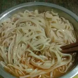 4.将面下入沸入锅后,不要搅动,当其从锅底自然漂起后,捞出在凉开水冲刷一下,再入锅复烫即捞出。