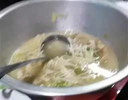 2.在锅内放清水17.5公斤(不可用井水或有碱性的水),烧开时把浮上的水泡沫打清,再将炸好的鲫鱼和鳝鱼骨一齐倒入烧沸,待汤色转白后加入熟猪油250克炸鱼的原油,大火烧透,然后用淘罗过清鱼渣,成为第一份白汤。
