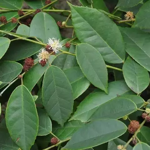 牛鼻栓又名连合子、木里仙。落叶小乔木或灌木,高2-5m。嫩枝有灰褐色柔毛;老枝有稀疏皮孔。单叶互生;叶柄长4-10mm;托叶早落;叶片膜质,倒卵形或倒卵状椭圆形,长5-16cm,宽3-9cm,先端渐尖,基部圆形或钝,稍偏斜,缘具波状锯齿;叶脉深入齿端小尖头,沿主脉和下面有星状毛。花杂性,两性花和雄花同长于一植株上;雄花序呈短葇荑状,有发育不全的雌蕊;两性花的花序长3-6cm;苞片及小苞片披针形,有星状毛;萼筒长1mm,无毛,萼齿5,卵形,长1.5mm,先端有毛;花瓣5,钻形,较萼片稍短;雄蕊5,花药卵形,长约1mm;子房半下位,2室,花柱2,向外卷曲。蒴果木质,卵圆形,长1.5cm,有白色皮孔,沿室间2片开裂,每片2浅裂。种子卵圆形,长约1cm,暗棕色,有光泽。花期4-5月,果期7-8月。