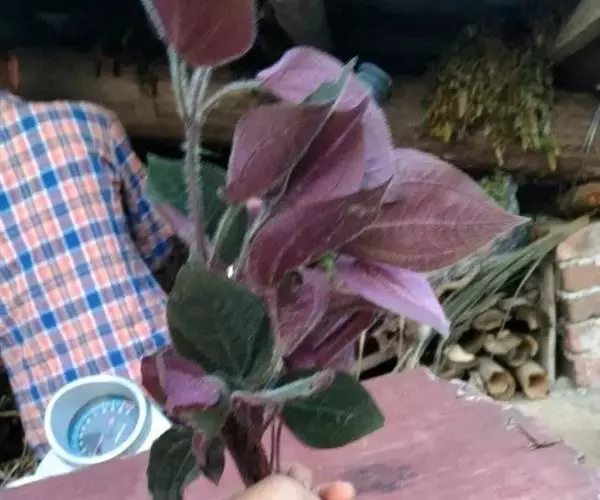 本变种与前者的主要区别是,叶片长圆形至卵状长圆形,长4-10厘米,宽2-5厘米,叶面被微柔毛,背面被长柔毛;花小,萼管长约5毫米,萼片长约3毫米;花瓣卵形,长约10毫米;雄蕊短,花药长约6毫米,微弯,不成膝曲状。花期7-8月,果期未详。