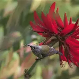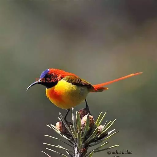 火尾太阳鸟(学名:Aethopyga ignicauda)为太阳鸟科太阳鸟属的鸟类。体长20厘米,色彩艳丽。雄鸟红色,具形长的艳猩红色中央尾羽。头顶金属蓝色,眼先和头侧黑色,喉及髭纹金属紫色。下体黄色,胸具艳丽的橘黄色块斑。雌鸟灰橄榄色,腰黄,体型比雄鸟小许多。虹膜褐色;嘴黑色;脚黑色。叫声为轻声颤音shweet。鸣声为单调的dzidzi-dzidzidzidzi声。