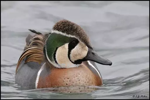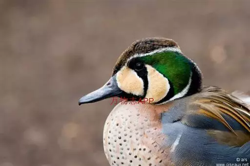 雄鸟繁殖羽头顶至后颈上部黑褐色,具淡棕色羽端。脸部自眼后有一宽阔的翠绿色金属带斑延伸至后颈下部;绿带与头颈部黑褐色之间有一白色狭纹,其余脸部呈乳黄色;在绿色带斑与乳黄色斑之间夹有黑色细线,并向颈侧下方延伸;黑色线与黄色脸斑之间还有白色细线;眼周黑色,并有一黑纹自眼周向下至喉部,从而将脸部乳黄色斑分割为前后两块。上背和两胁蓝灰色,密布以黑褐色波状细纹;下背至尾上覆羽暗褐色,具淡色羽缘;尾上覆羽尤淡,尾羽褐色,具细狭的棕白色羽缘;肩羽长而细,内翈棕白色,外翈绒黑色,具宽的棕红色羽缘。翅上覆羽暗褐色,大覆羽具宽的棕色端斑,形成翼镜前面棕色边缘。翼镜铜绿色,后面转为黑色,再后白色。颏、喉和前颈上部黑褐色,胸淡棕色,满杂以暗褐色点状斑,下胸两侧各具一宽阔的白色横带。腹白色,尾下覆羽黑褐色,中部具棕白色端斑,两侧具暗棕色羽缘,尾下覆羽两侧前面各有一白色宽带。腋羽白色。非繁殖羽似雌鸟。