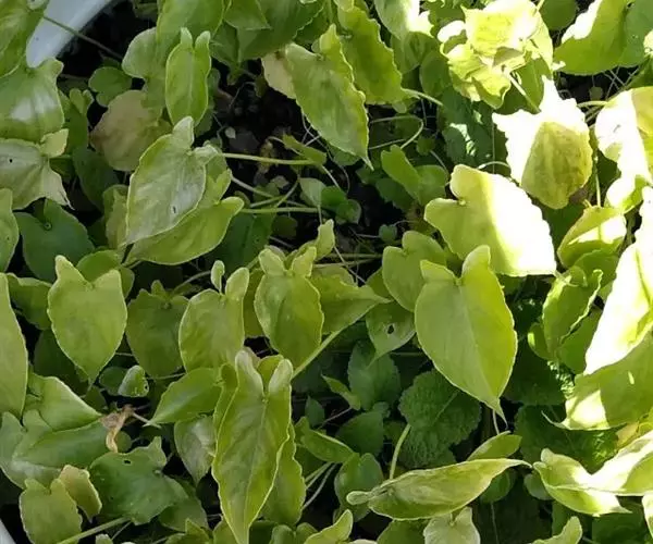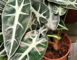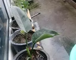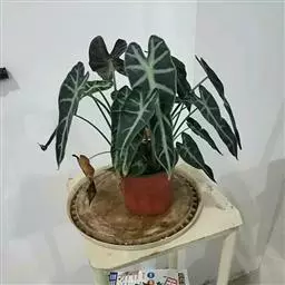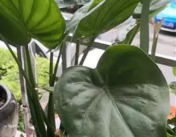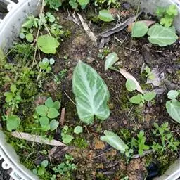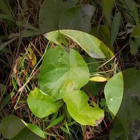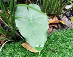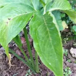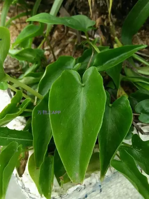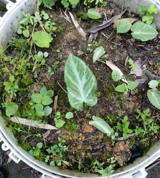 块茎球形、卵球形至长圆形,长2-4厘米,粗1-1.8厘米,表面密生多数须根。叶1,叶柄长12-25厘米,常紫色或绿色具紫斑,几无鞘,下部及顶头各有珠芽1枚。幼株叶片心状长圆形,长4厘米,宽2厘米;多年生植株叶片心形、心状三角形、心状长圆形或心状戟形,表面绿色、暗绿色,背面淡绿色或红紫色,二面沿脉颜色均较淡,先端长渐尖,有时成尾状,基部心形;长6-25厘米,宽2.5-7.5厘米;后裂片圆形或锐尖,稍外展。