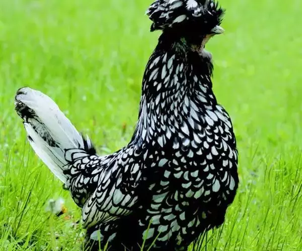 贵妇鸡形态奇特,体型娇小玲珑。冠为羽毛凤冠,成年雄鸡更明显。冠体前有一独立的呈锥形小冠体,冠体为豆冠,冠体两侧为碗状发达的肉质体,延伸为“V”形肉质角状冠,色泽鲜红、细致,后侧形如圆球状的大朵黑白花片羽毛束,好似西洋贵妇人的帽子,因而得名贵妇鸡。