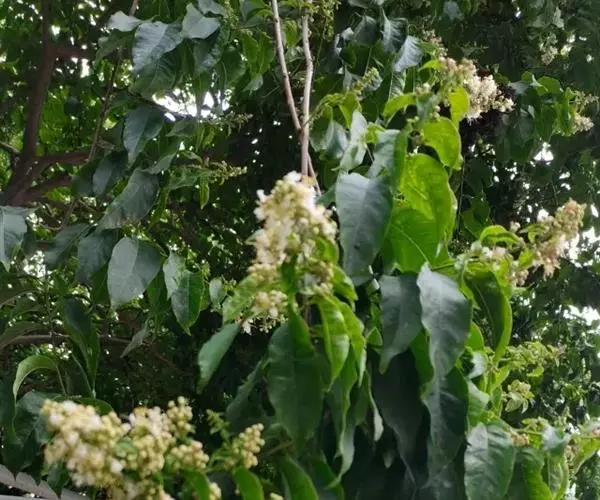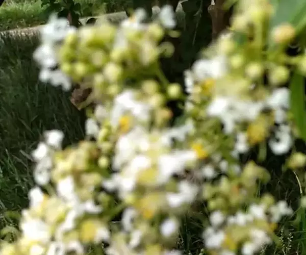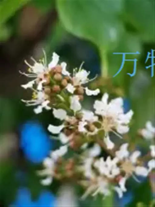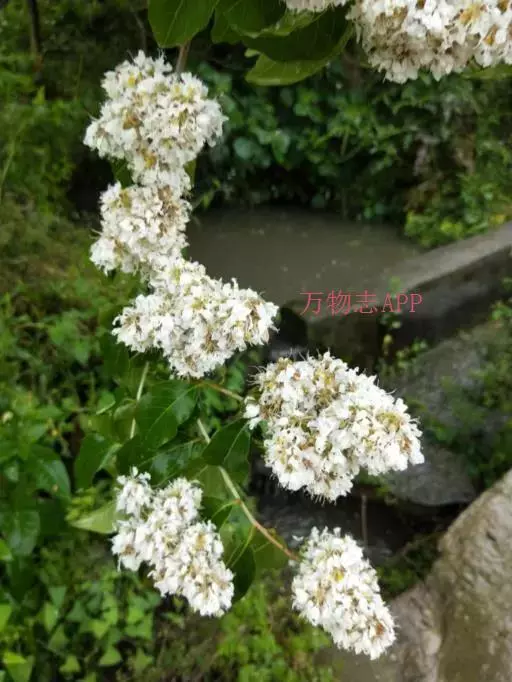 花小,白色或玫瑰色,直径约1厘米,组成顶生圆锥花序,长5-15厘米,具灰褐色微柔毛,花密生;花萼有棱10-12条,长3.5-4.5毫米,5裂,裂片三角形,直立,内面无毛;花瓣6,长2-6毫米,皱缩,有爪;雄蕊15-30,约5-6枚较长,12-14条较短,着生于萼片或花瓣上,花丝细长;子房无毛,5-6室。