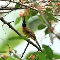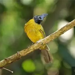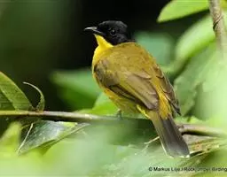 黑头鹎(学名:Brachypodius atriceps ):体长17厘米。是一种中等体型的偏黄色鹎。特征为头辉黑、喉黑而眼蓝。上体黄橄榄色;两翼及尾偏黑,具明显的黄色尾端;下体绿黄色。另一罕见色型为灰色,尾缘白色。与黑冠黄鹎的区别在无羽冠且尾端黄色。虹膜浅蓝色;嘴黑色色;脚深褐。