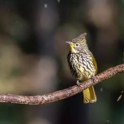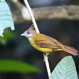 白喉冠鹎:体长20-25厘米。头顶红褐色,有长而细的羽冠、红褐色,头侧灰色。上体橄榄绿黄色,…
