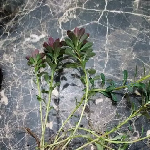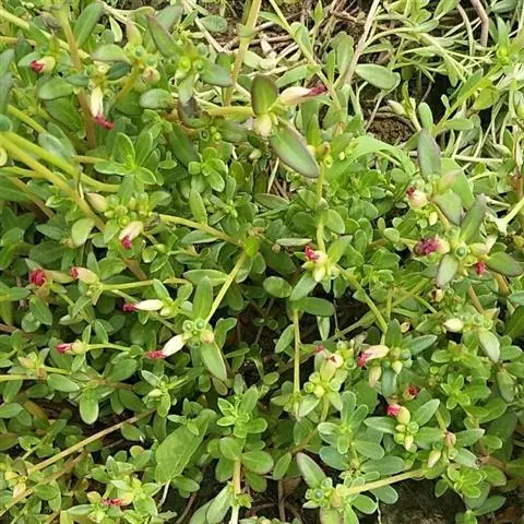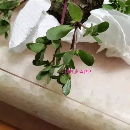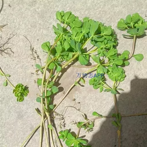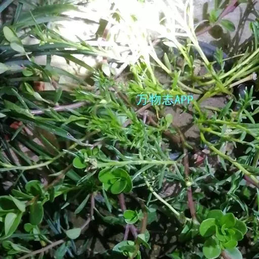 一年生草本,全株无毛。茎平卧或斜倚,伏地铺散,多分枝,圆柱形,长10-15厘米淡绿色或带暗红色。茎紫红色,叶互生,有时近对生,叶片扁平,肥厚,倒卵形,似马齿状,长1-3厘米,宽0.6-1.5厘米,顶端圆钝或平截,有时微凹,基部楔形,全缘,上面暗绿色,下面淡绿色或带暗红色,中脉微隆起;叶柄粗短。