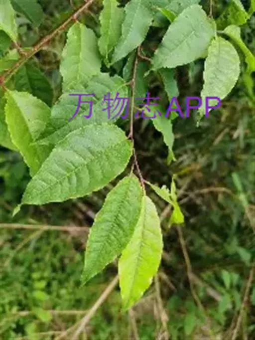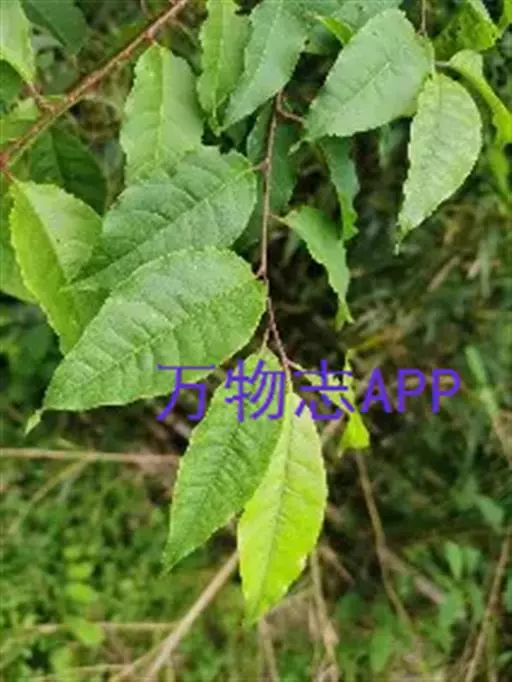 叶片椭圆形或长圆椭圆形,稀倒卵椭圆形,长4-10厘米,宽2.5-5厘米,先端尾状渐尖或短渐尖,基部圆形、宽楔形,偶有楔形,边缘有贴生锐锯齿,上面深绿色,下面淡绿色,两面无毛;叶柄长1-1.5厘米,通常无毛,无腺体,有时在叶片基部边缘两侧各有1个腺体;托叶膜质,线形,先端渐尖,边有腺齿,早落。