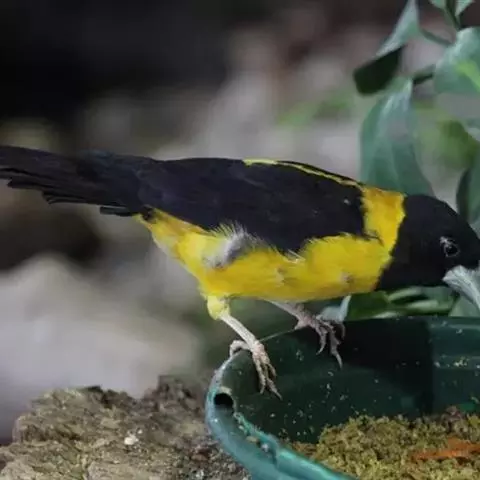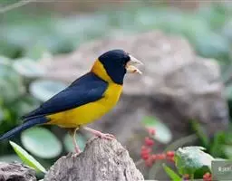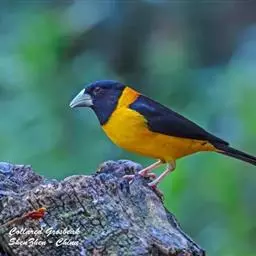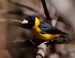 黄颈拟蜡嘴雀:小型鸟类,体长20-22厘米。嘴粗大,黑色。雄鸟整个头、颈、颏、喉和上胸辉黑色,…