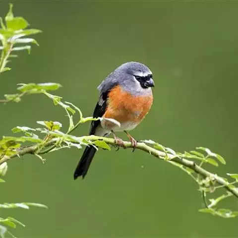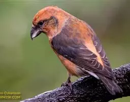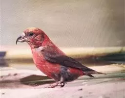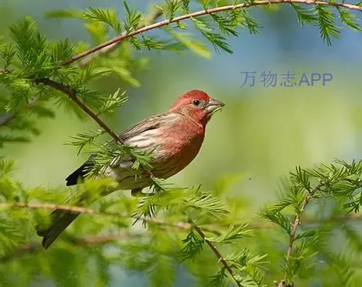 红腰朱雀:体长12-14厘米,小型鸟类。雄鸟前额和眉纹玫瑰粉红色,头顶和一宽的贯眼带深红褐色,背红…