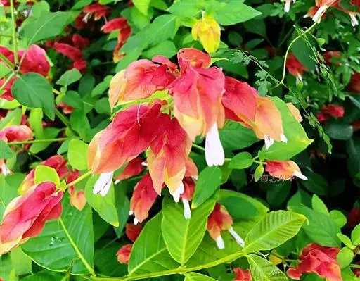 虾衣花(Calliaspidia guttata (Brandegee) Bremek. )是爵床科、麒麟吐珠属的多年生草本或常绿亚灌木。株高1-2米,茎细弱,多分枝,全株被毛。叶卵形或椭圆形,全缘。穗状花序顶生、下垂,长6-9厘米,具棕、红、黄绿或黄色宿存苞片,花白色、唇形,花形似虾,上唇全缘或梢2裂,下唇3浅裂,基部有3行紫色斑点。蒴果(一说蒴果末见 )。