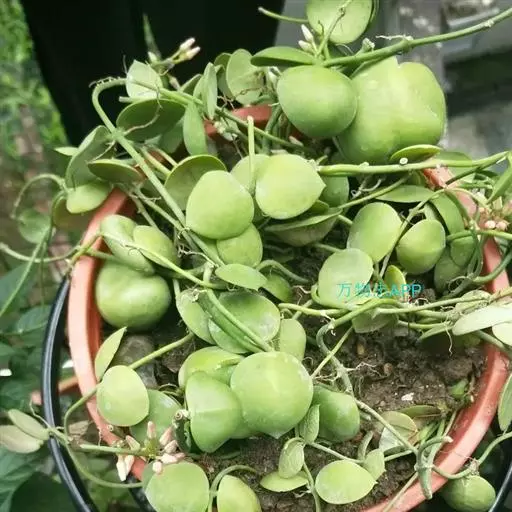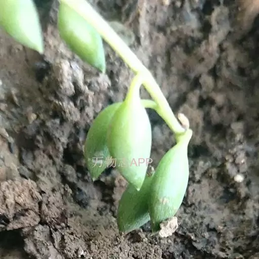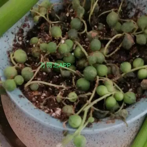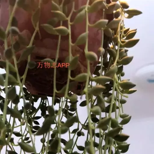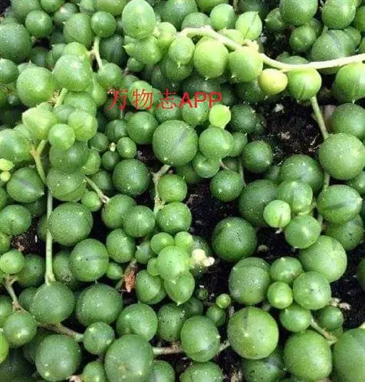 为多年生常绿匍匐生肉质草本植物。茎纤细,全株被白色皮粉。叶互生,较疏,圆心形,深绿色,肥厚多汁,极似珠子,故有佛串珠、绿葡萄、绿之铃之美称。头状花序,顶生,长3~4厘米,呈弯钩形,花白色至浅褐色。花期:12月至翌年1月。