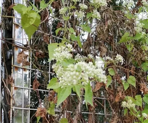 薇甘菊((学名:Mikania micrantha Kunth),也称小花蔓泽兰或小花假泽兰。是菊科多年生草本植物 或灌木状攀缘藤本,平滑至具多柔毛;茎圆柱状,有时管状,具棱;叶薄,淡绿色,卵心形或戟形,渐尖,茎生叶大多箭形或戟形,具深凹刻,近全缘至粗波状齿,或牙齿,长4.0-13.0厘米,宽2.0-9.0厘米。圆锥花序顶生或侧生,复花序聚伞状分枝;头状花序小,花冠白色,喉部钟状,具长小齿,弯曲;瘦果黑色,表面分散有粒状突起物;冠毛鲜时白色。