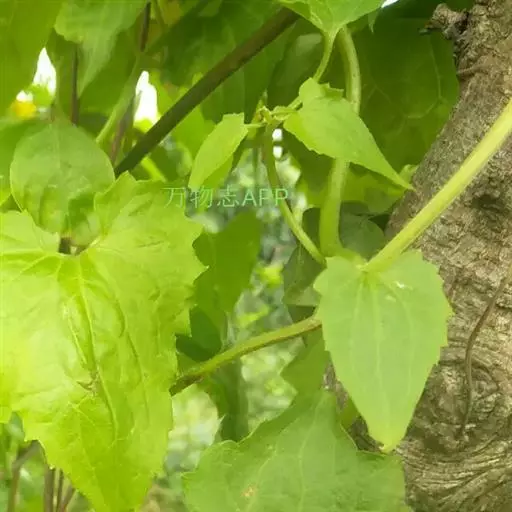 薇甘菊为多年生草质或木质藤本,茎细长,匍匐或攀缘,多分枝,被短柔毛或近无毛,幼时绿色,近圆柱形,老茎淡褐色,具多条肋纹。茎中部叶三角状卵形至卵形,长4.0-13.0厘米,宽2.0-9.0厘米,基部心形,偶近戟形,先端渐尖,边缘具数个粗齿或浅波状圆锯齿,两面无毛,基出3-7脉;叶柄长2.0-8.0厘米;上部的叶渐小,叶柄亦短。