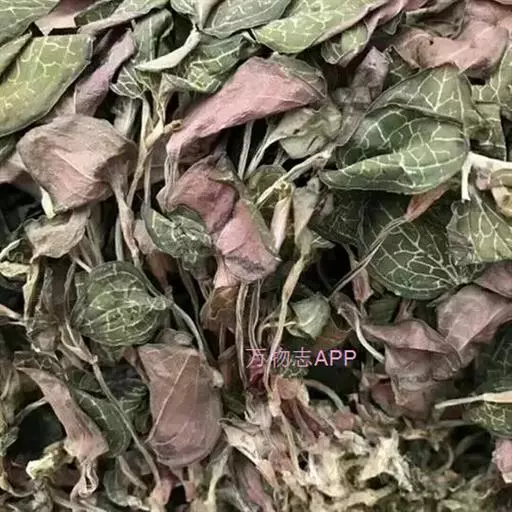 福建金线莲(Anoectochilus roxburghii) 呈皱缩卷曲,不规则状的干燥全草,根茎圆柱形,多弯曲,长1-5cm,表面棕褐色,茎节明显,有金黄色网状脉,下部集生2-4片叶,叶互生,多卷缩而完整,展开为宽卵形,表面黑棕色、下面暗红色,部分叶脉紫红色,主脉3~7条,叶柄基部鞘状抱茎,偶见总状花序顶生,花暗棕色,少见蒴果矩圆形,香气特异,味淡。其雄株于雌株略有差别,主要在于雌株的叶脉更为深,而雄株几乎见不到叶脉。