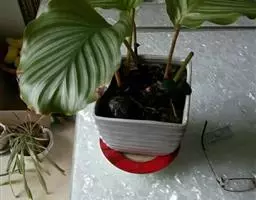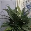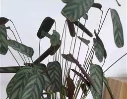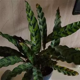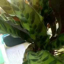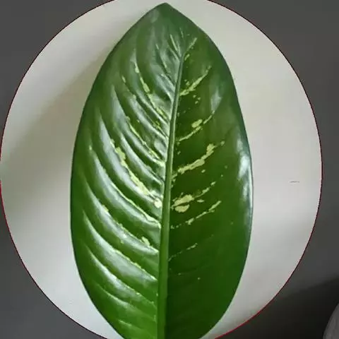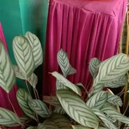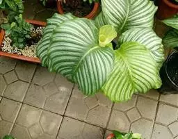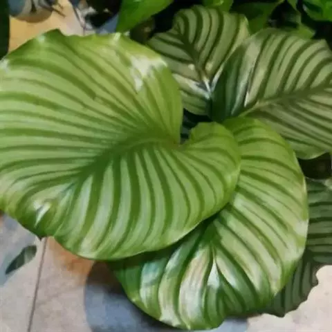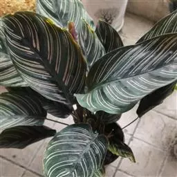 孔雀竹芋(学名:Calathea makoyana E. Morr.):竹芋科,肖竹芋属多年生常绿草本。植株挺拔株高可达60厘米。叶柄紫红色, 叶片薄革质,卵状椭圆形,叶面上有墨绿与白色或淡黄相间的羽状斑纹,就像孔雀尾羽毛上的图案,因而得名。叶片亦有特性:白天舒展,晚间折叠起来。
